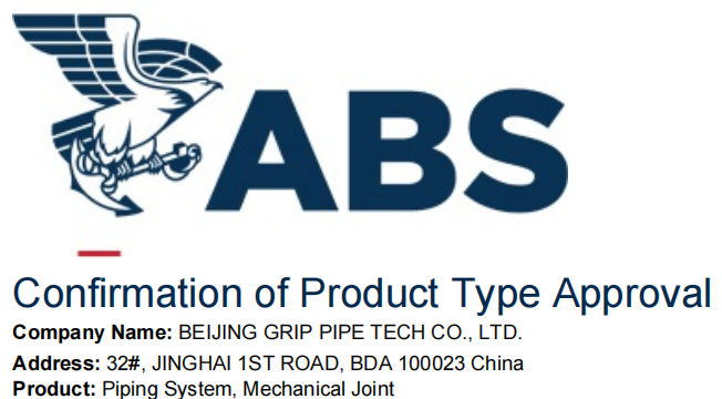 In Novermber of 2021, following RINA certificate, Beijing Grip pipe Coupling-Mechanical seals pipe system, also have been apporved by ABS.